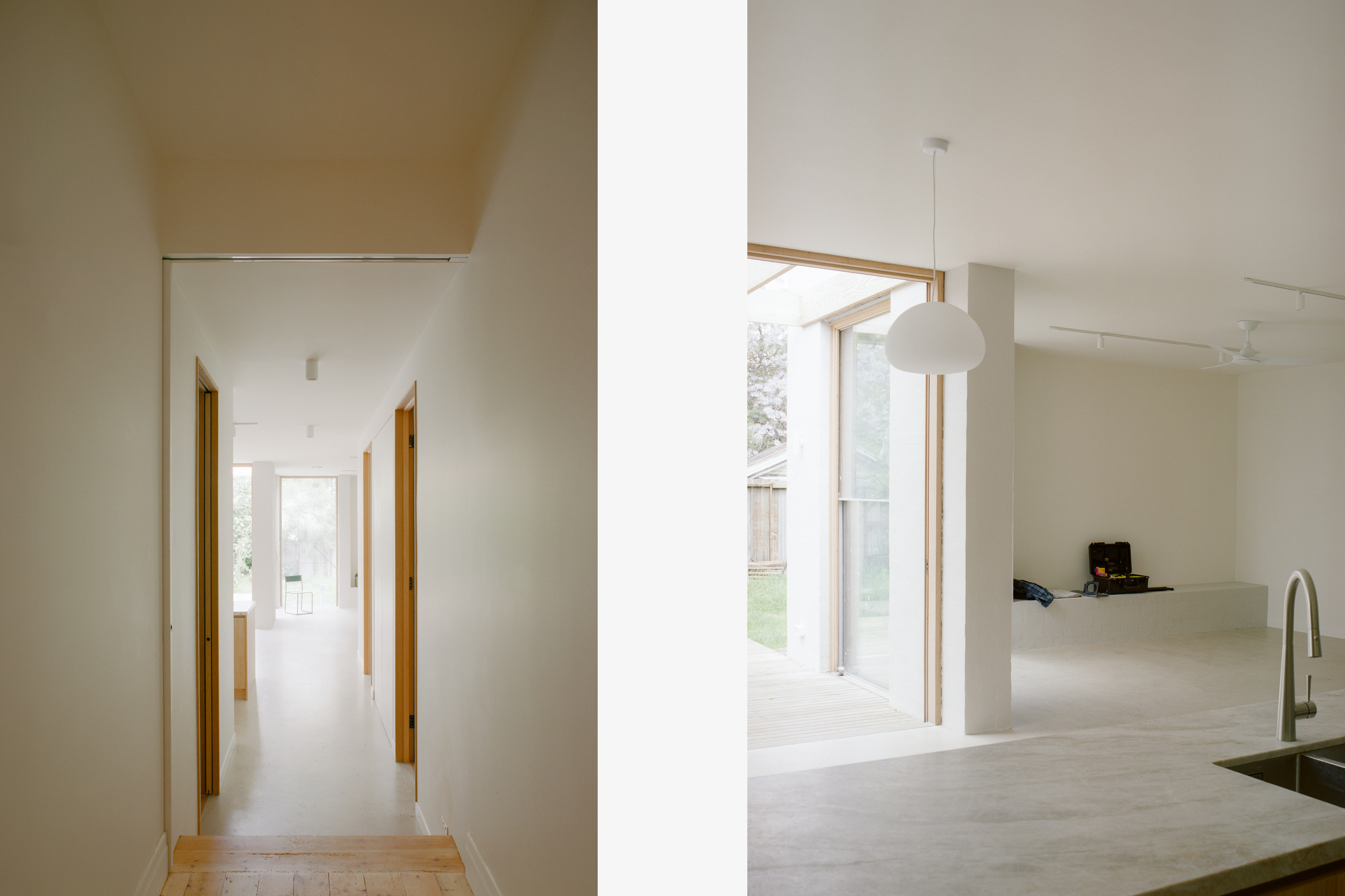 A modest lean-to at the rear was removed and replaced with a single-storey addition, positioned at the natural threshold between old and new. The extension accommodates kitchen, dining and living spaces alongside supporting amenities, opening the home directly to the garden beyond. A subtle two-step descent allows the house to respond to the site’s gentle fall, grounding the new work and strengthening the indoor–outdoor connection.